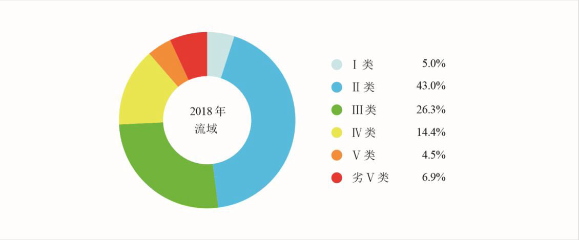 2018年,长江、黄河、珠江、松花江、淮河、海河、辽河七大流域和浙闽片河流、西北诸河、西南诸河监测的1613个水质断面中,Ⅰ类占5.0%,Ⅱ类占43.0%,Ⅲ类占26.3%,Ⅳ类占14.4%,Ⅴ类占4.5%,劣Ⅴ类占6.9%。与2017年相比,Ⅰ类水质断面比例上升2.8个百分点,Ⅱ类上升6.3个百分点,Ⅲ类下降6.6个百分点,Ⅳ类下降0.2个百分点,Ⅴ类下降0.7个百分点,劣Ⅴ类下降1.5个百分点。