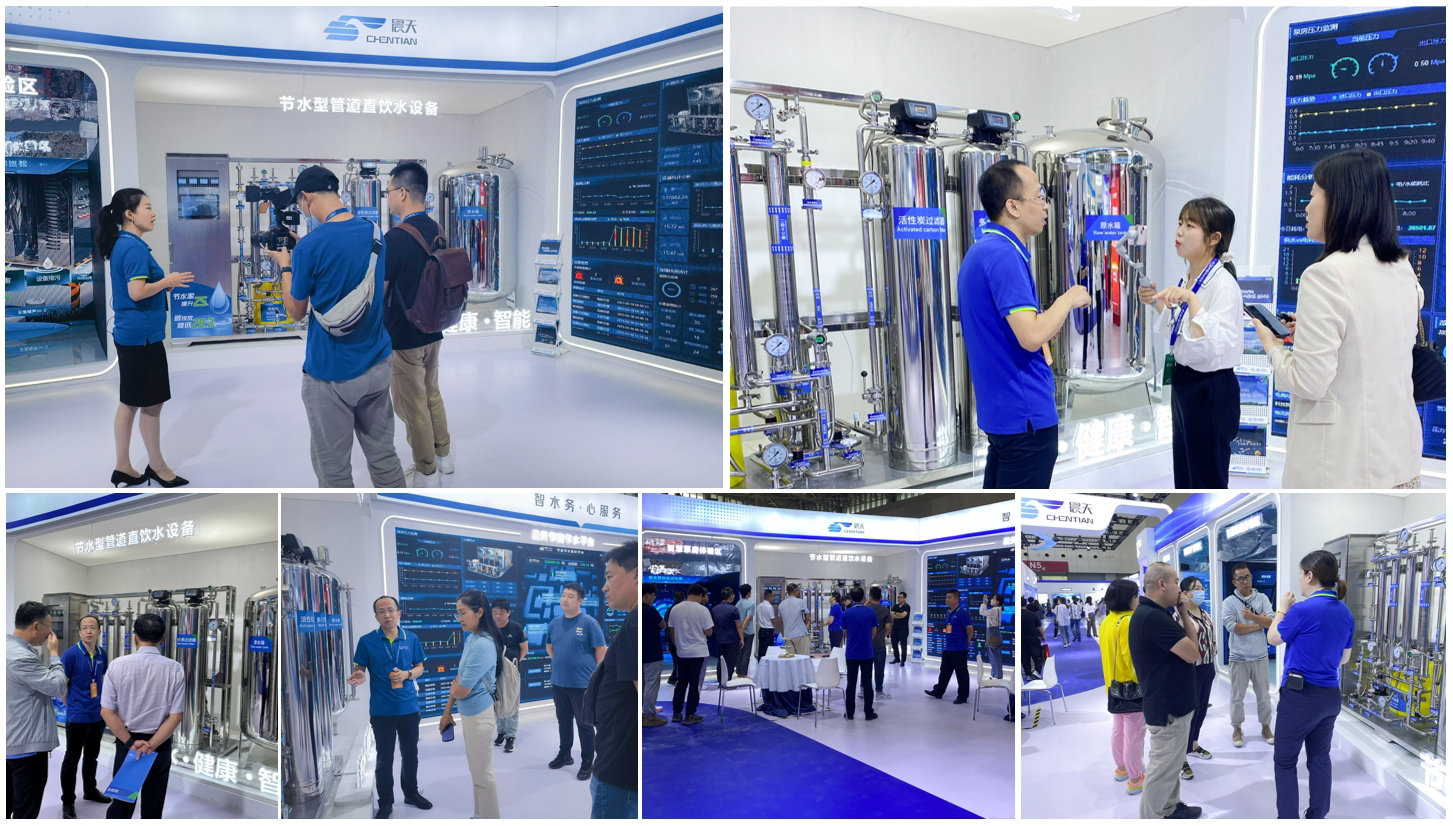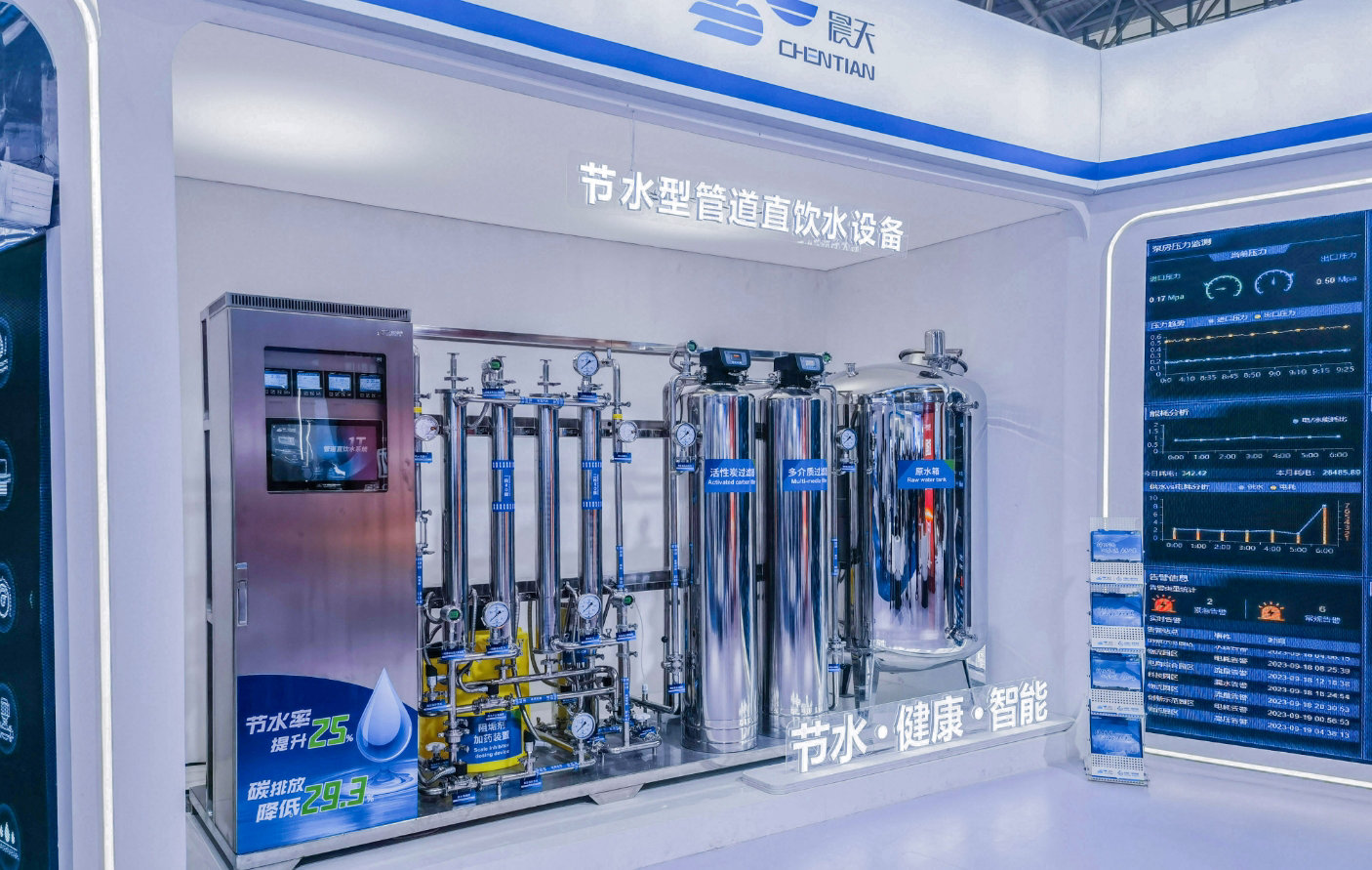 在同期举办的节水技术与装备展览上,晨天环境作为城镇优质供水的专业服务企业,展示了新研发的节水型管道直饮水设备。管道直饮水技术是在原有城镇供水系统基础上增设分质供水系统,可有效保障居民饮水安全,但也存在水资源浪费,运维困难等主要矛盾。而此次论坛上,晨天环境的节水型管道直饮水设备吸引了众多与会嘉宾驻足交流,并受到城镇供水领域专家的关注与认可。