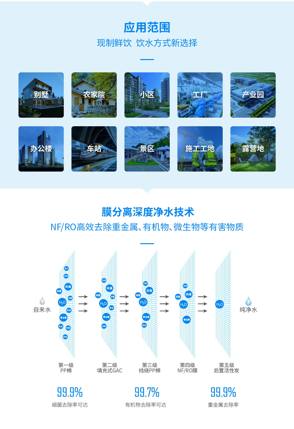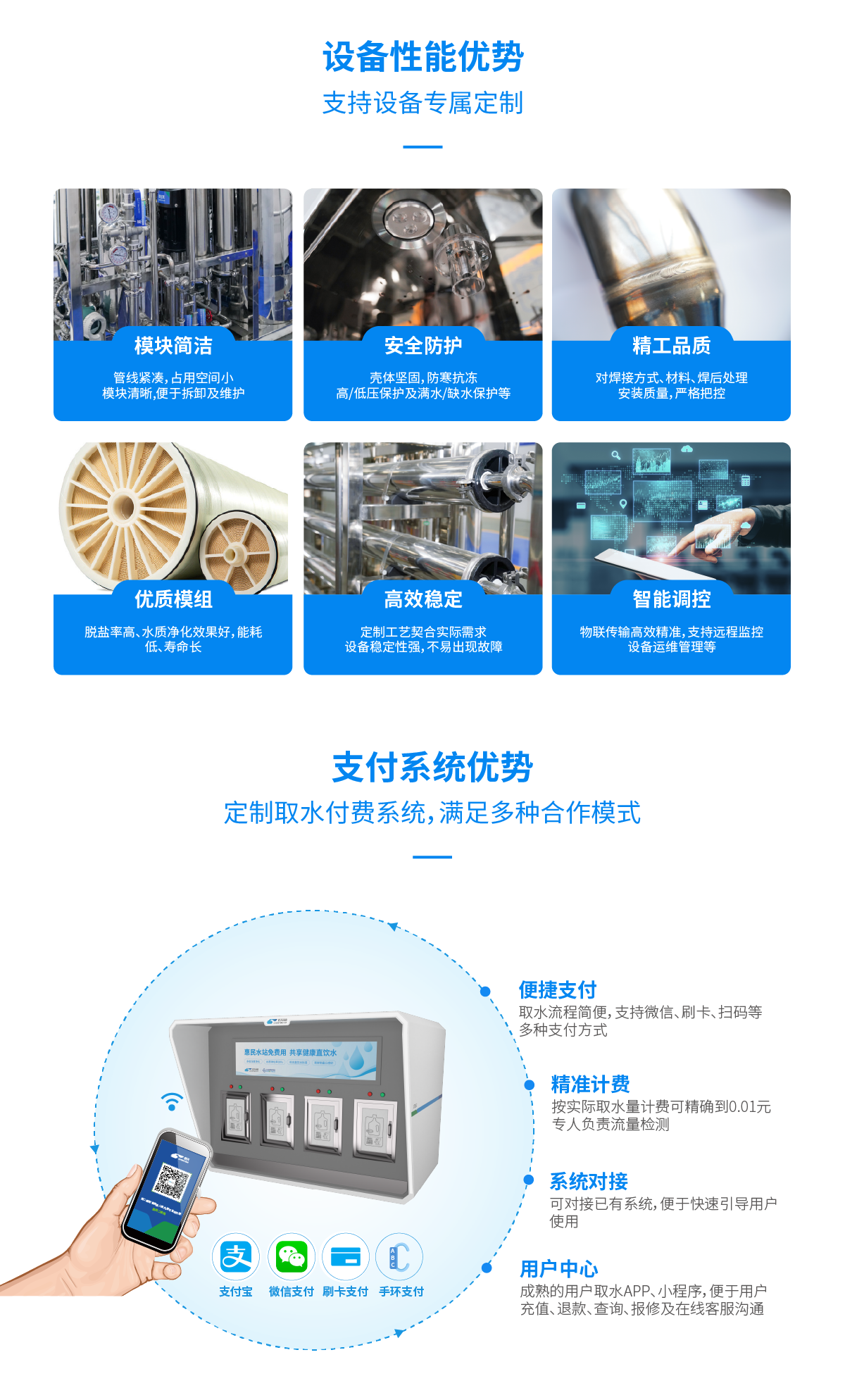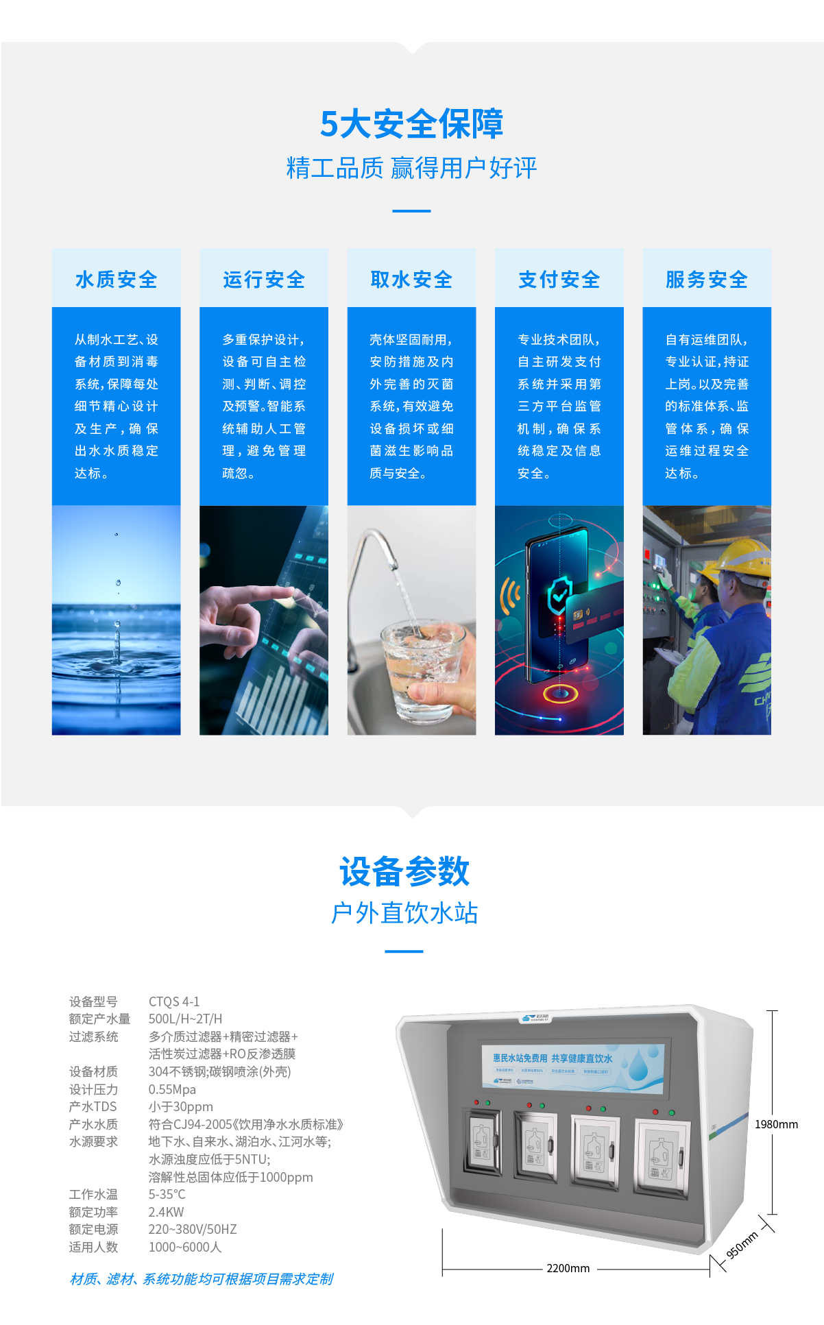 小区户外直饮水站作为户外普遍使用的直饮水设备,需具备多种规格型号,制水系统可根据项目需求定制。户外直饮水设备的安装及使用方式简便,可快速投入使用。为减少外部环境影响,设备壳体坚固,安全性高,可大幅降低人为破坏可能性,同时具备多重防护技术,保障直饮水水质安全、取水安全、支付安全。